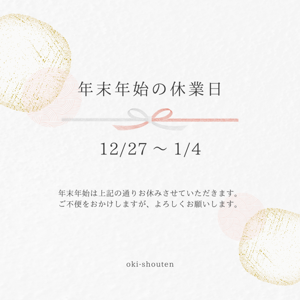 有限会社沖商店では誠に勝手ながら、年末年始休業日を下記のとおりとさせていただきます。